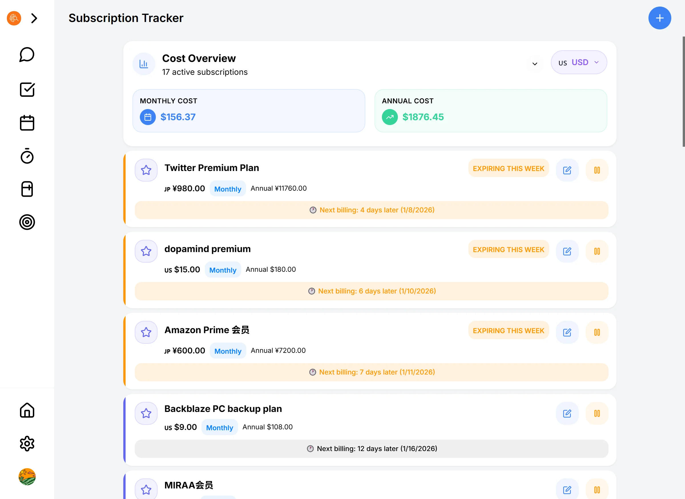- One-Tap Pause/Resume: Cancelled for now? No problem. Mark it as "Inactive" instead of deleting it, so you can easily restore it later.